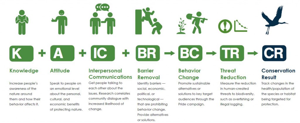 Rare’s focus upon changing individuals’ knowledge, attitudes and behaviours is embedded in its Theory of Change – the basis of its campaigns. Rare summarises this theory in the formula ‘an increase in knowledge plus a change in attitude, interpersonal communication and barrier removal leads to behavior change, which leads to threat reduction, and, ultimately, a conservation result’: